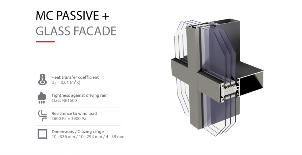 The improved thermal performance results from application of a new insulator made of innovative materials, which made it possible to obtain an even better heat-transfer coefficient – Uf starting at 0,61 W/m2K. MC Passive+ offers one of the highest technical parameters among aluminium facade systems available on the market to respond to needs of the energy-saving and passive building industry.