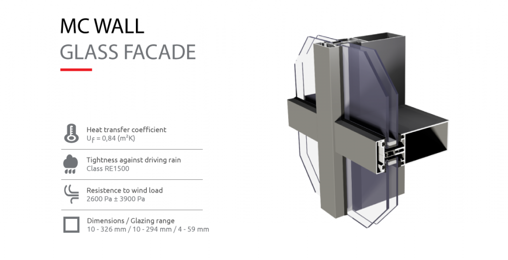 A system used to design modern curtain walls. The system is a basis for facade structures: MC Passive, MC Passive+, MC Glass and MC Fire, MC Glass Fire (a solution for fire protection). The MC Wall system offers many possibilities