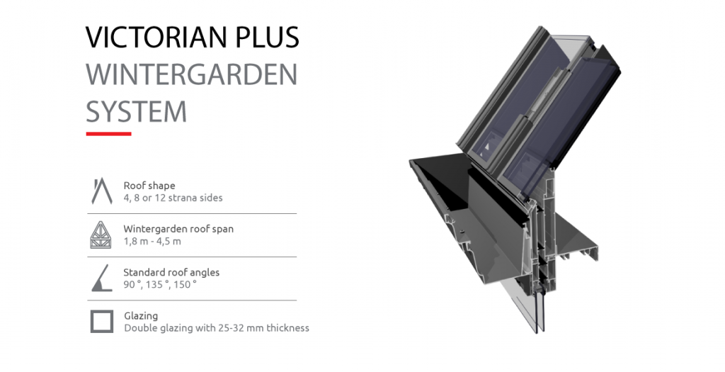 Technical description: – rafter fixed in the eave and the ridge using pinned hinge fasteners – engineered corner joints of various angles: convex and concave; – available valley beams and rafter blocks (rafter of various heights to obtain a span of the winter garden roof from 1,8 m to 4,5 m.) – separate gutter fixed to the eave profile using hangers providing a slope and a separate eave profile – option of installation above and below gutters – profiles and ornamental elements (decorative combs, structural ties, enclosures of discharge chutes) – Victorian Plus is a system suitable for filling made of wall polycarbonate as well as glazed units